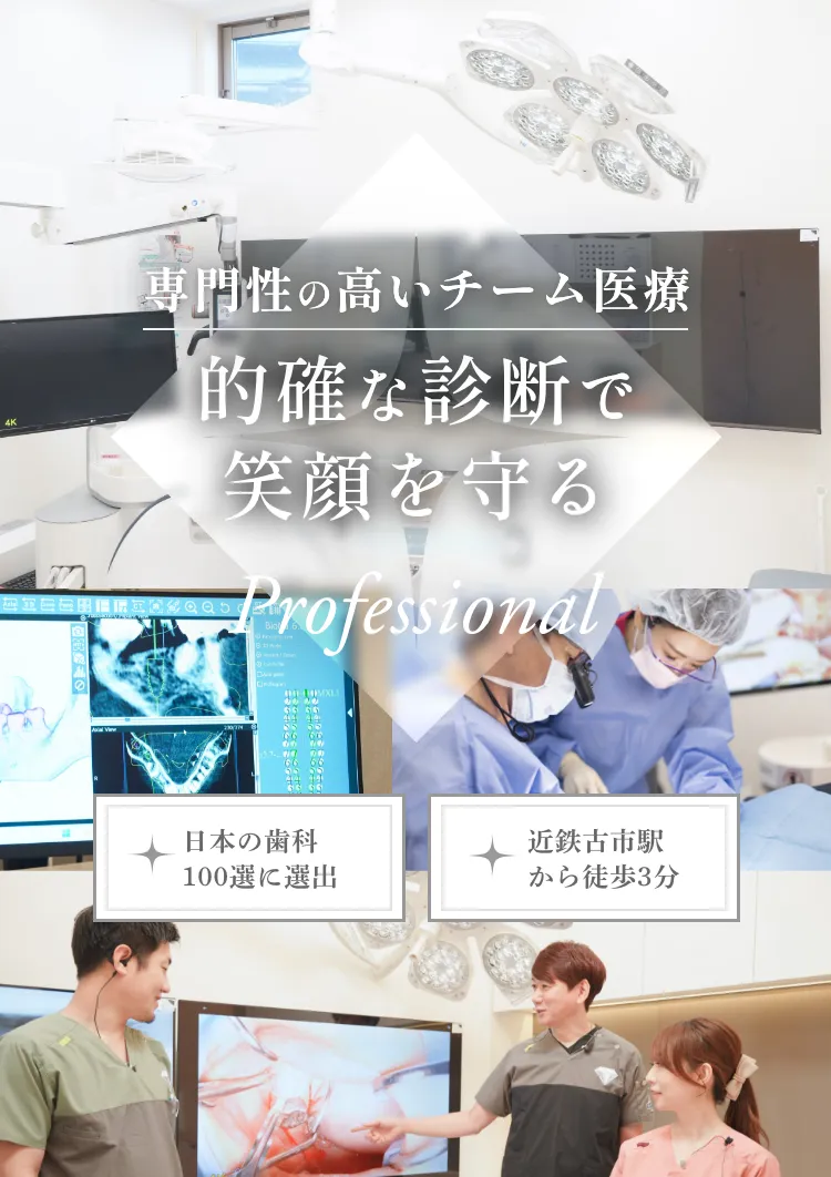 歯を抜くのが嫌な方、保険適用の治療で安く診察を受けたい方など、患者様それぞれのお悩みに耳を傾け、専門医と専任の歯科衛生士がチームとなり、小さなご要望にもお応えできる、患者様の口腔内の診察に対して最善の体制を整えています。