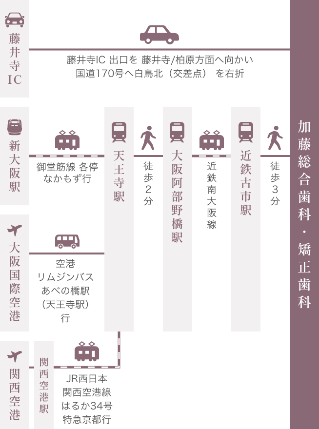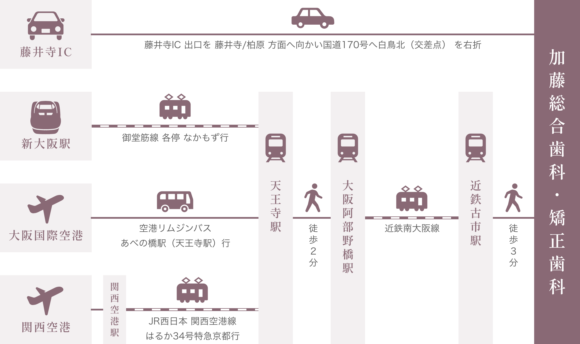 大阪の羽曳野市にある加藤総合歯科・矯正歯科は、近鉄古市駅から徒歩3分。無料専用駐車場に、パーキングもすぐ近くにあり、お勤めの方もご年配の方にも、とても通いやすい場所にあります。