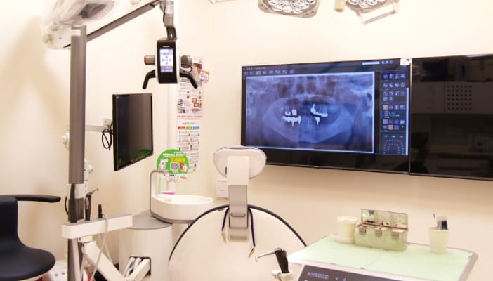 一般的なマイクロスコープの倍率20倍を遥かに上回る4K・80倍の高解像度で患部を診ることができる「マイクロスコープ」という歯科用の顕微鏡を導入しています。これを使用することで、細部に渡って感染物質の除去やきめ細やかな形成処置などが可能になり、出来る限り天然歯を残し、再発を防止するための処置が可能となります。